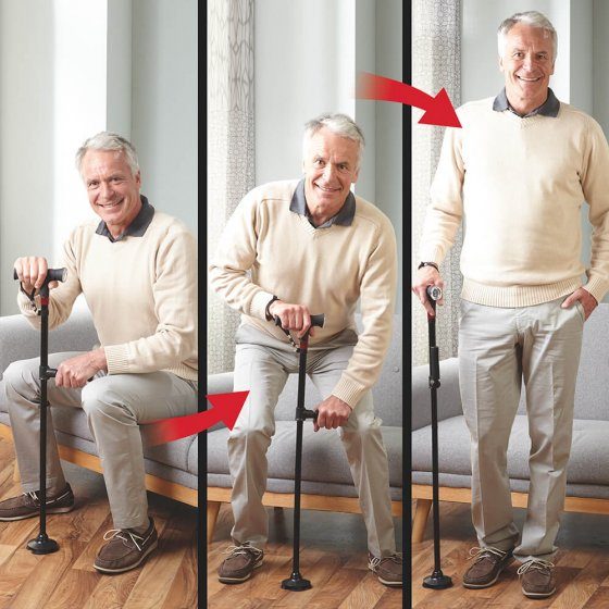 Ein Gehstock mit breiterem Standfuß und einem ausklappbarer Zweitgriff machen Gehstöcke nicht nur zur perfekten Geh-, sondern auch zur Aufstehhilfe, die einem das Aufstehen aus sitzender Position erleichtert.