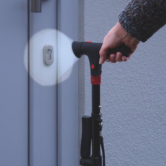 Ein Gehstock mit zuschaltbarem roten Blinklicht und ein weißes LED-Licht im Griff sorgen bei Dunkelheit für mehr Sicherheit. Auf Knopfdruck können Sie sogar eine Alarmsirene ertönen lassen.